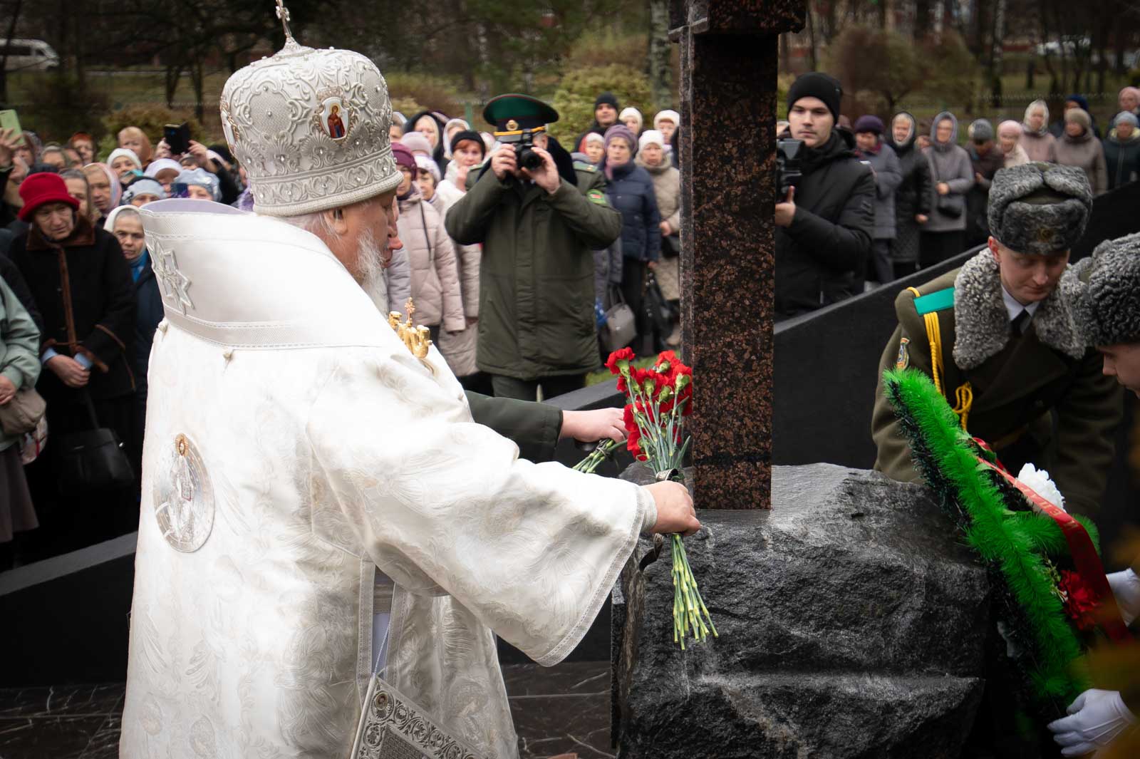 По завершении богослужения состоялся крестный ход, после чего у Поклонного креста, установленного в память о героях-пограничниках, были возложены венки и цветы.